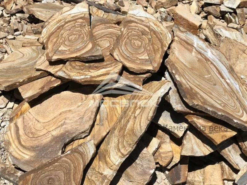 Песчаник Шкура тигра – Это плитняк имеющий желто-рыжий цвет с отчетливыми коричневыми полосами. Каждый отдельный узор на таком природном камне это настоящее искусство созданное природой. Именно благодаря своей окраске он и приобрёл своё название тигровый. Используется для мощения пешеходных дорожек и облицовки. Толщина 18-25 мм, 25-30 мм, 30-45 мм.