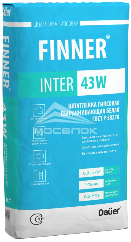 Шпатлевка гипсовая выравнивающая Dauer FINNER INTER 43 W белая 100, 20 кг основные преимущества: