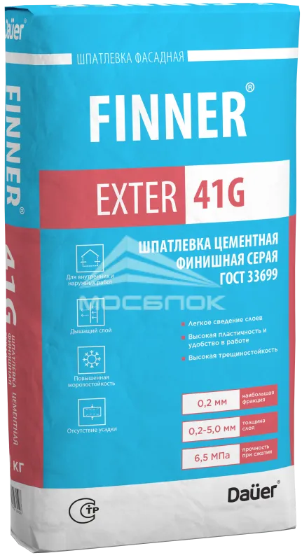 Шпатлевка цементная финишная Dauer FINNER EXTER 41G серая 180/6,5/F50, 20 кг основные преимущества: