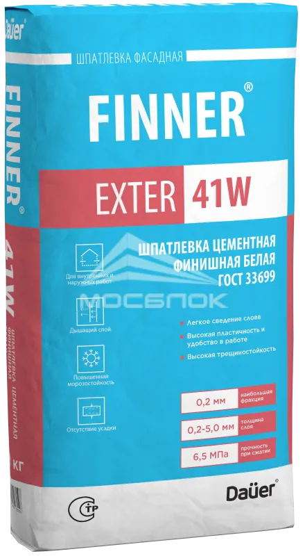 Шпатлевка цементная финишная Dauer FINNER EXTER 41W белая 180/6,5/F50, 20 кг основные преимущества: