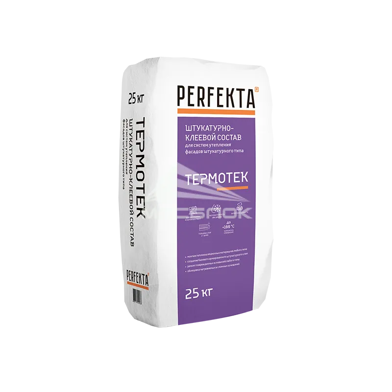ШТУКАТУРНО-КЛЕЕВОЙ СОСТАВ Perfekta® "ТЕРМОТЕК" ЗИМНЯЯ СЕРИЯ предназначен для выполнения работ при отрицательных температурах по монтажу всех видов теплоизоляционных пенополистирольных и минераловатных плит и создания армированного базового штукатурного слоя при устройстве систем фасадных теплоизоляционных композиционных (СФТК) с тонким штукатурным слоем, а также иных конструкций с применением теплоизоляционных плит внутри и снаружи зданий.