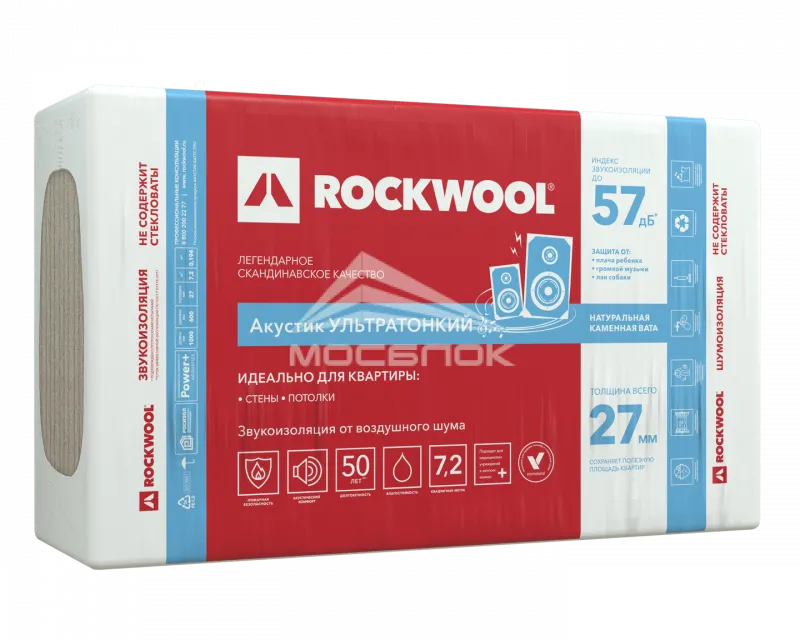 Технический список с ключевыми характеристиками Акустик УЛЬТРАТОНКИЙ ROCKWOOL, 1000 х 600 х 27 мм, подкрепленный конкретными цифрами и параметрами: